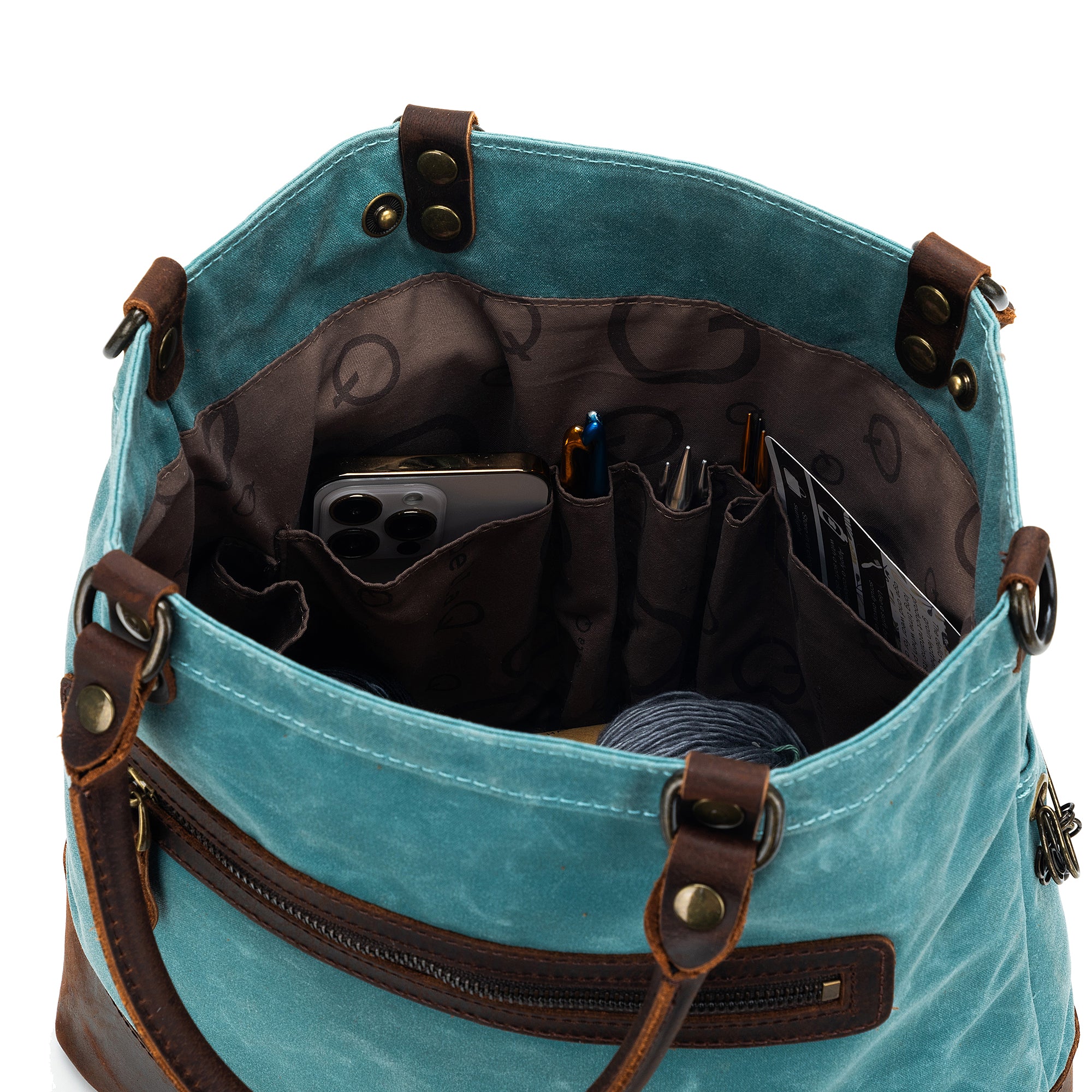 Bring your projects on your next adventure with the della Q Maker's Canvas Tote! This tote makes making on the go a cinch with enough space to hold your yarn, needles, bits, bobbles, patterns, and so much more! The elegant, whispy, cloudlike scarring of the genuine leather accents and waxed canvas make it unique to you and eye-catching to boot while the color-blocked aesthetic lends itself to be cozy as it cradles your goods with ease. Suitable for knitters and crocheters alike, you'll never have to be without your project again!