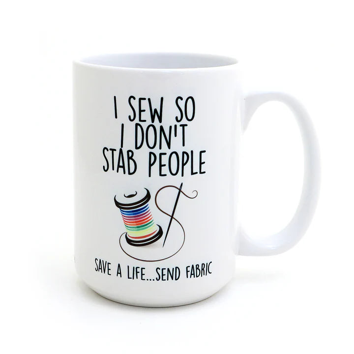 Add some humor to your morning routine with this 15 oz stoneware mug that reads "I sew so I don't stab people." Crafted from stoneware clay, it's perfect for daily use and can be safely used in the microwave and dishwasher. Features a scissor silhouette and a playful reminder not to run with a mug in hand.
