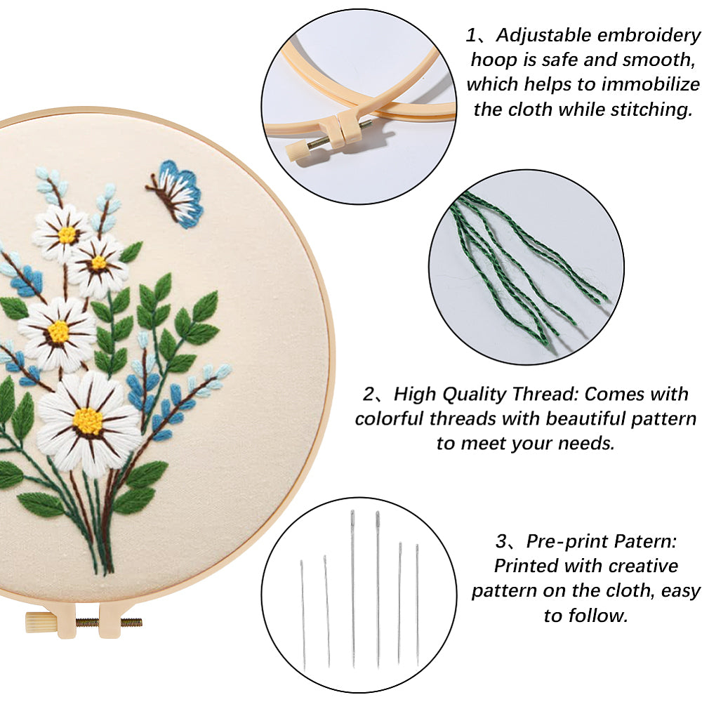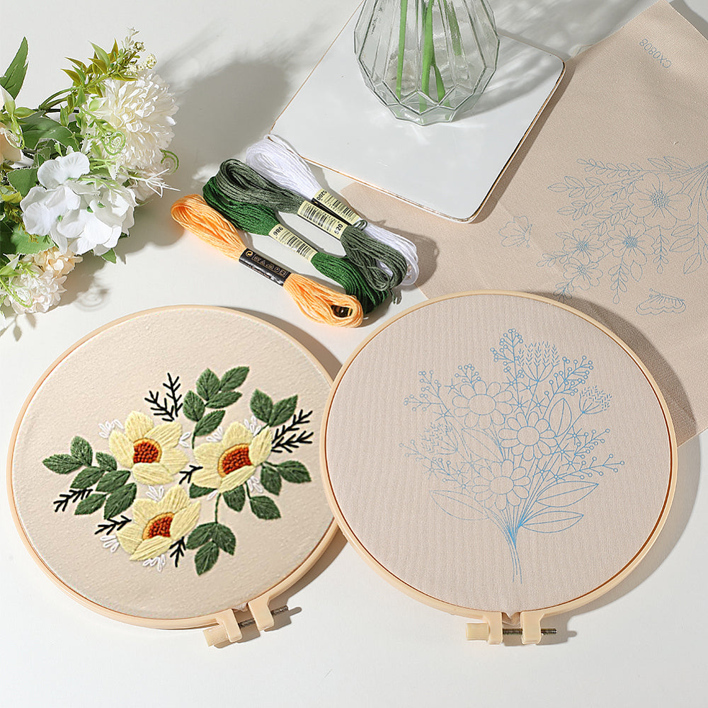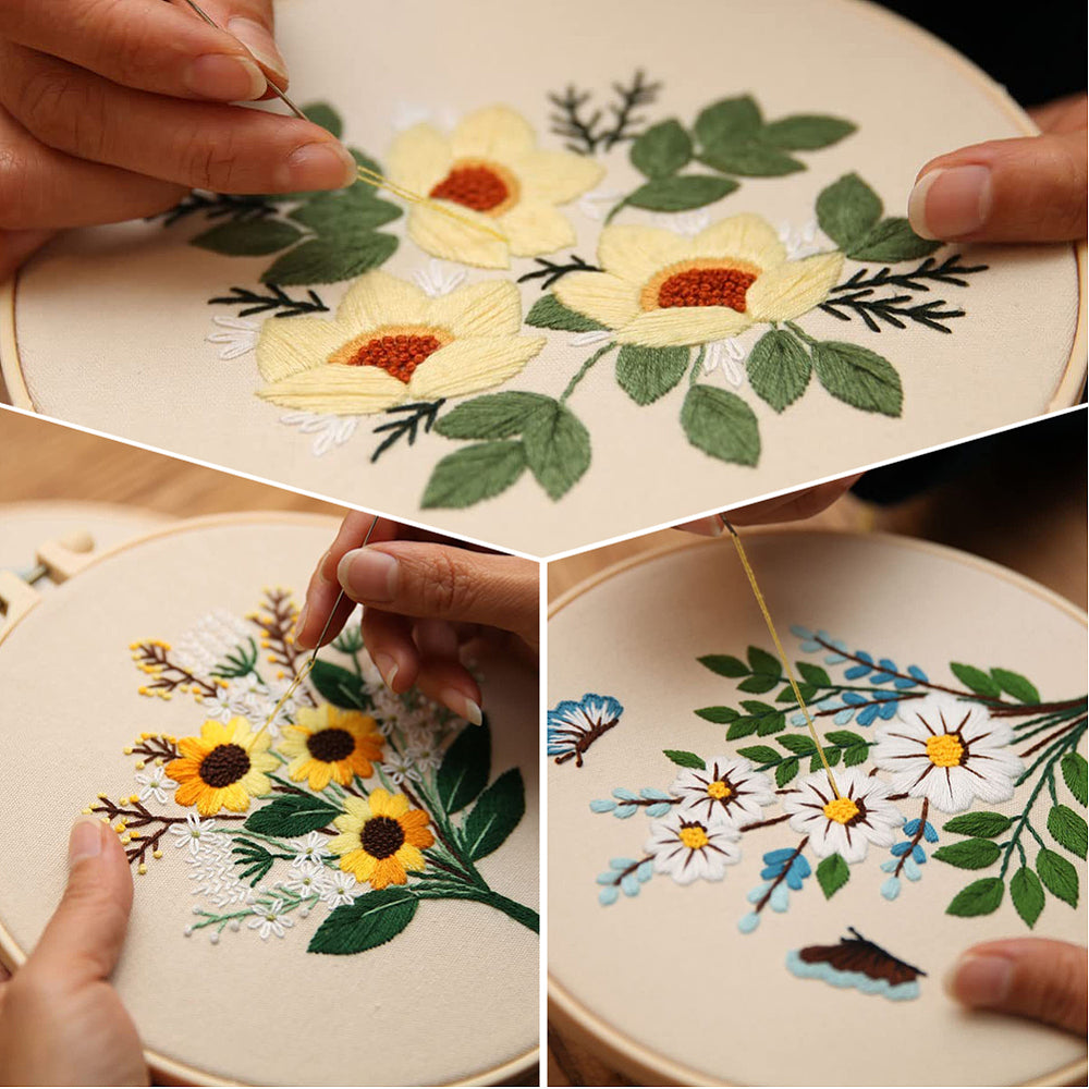 Capture the essence of a sun-drenched garden with our Garden Bloom Embroidery Kit. This curated trio of designs features cheerful sunflowers, delicate daisies, and elegant cream blossoms. With its soft beige fabric background and vibrant thread palette, this kit is designed to create heartwarming décor that adds a touch of nature to any room.